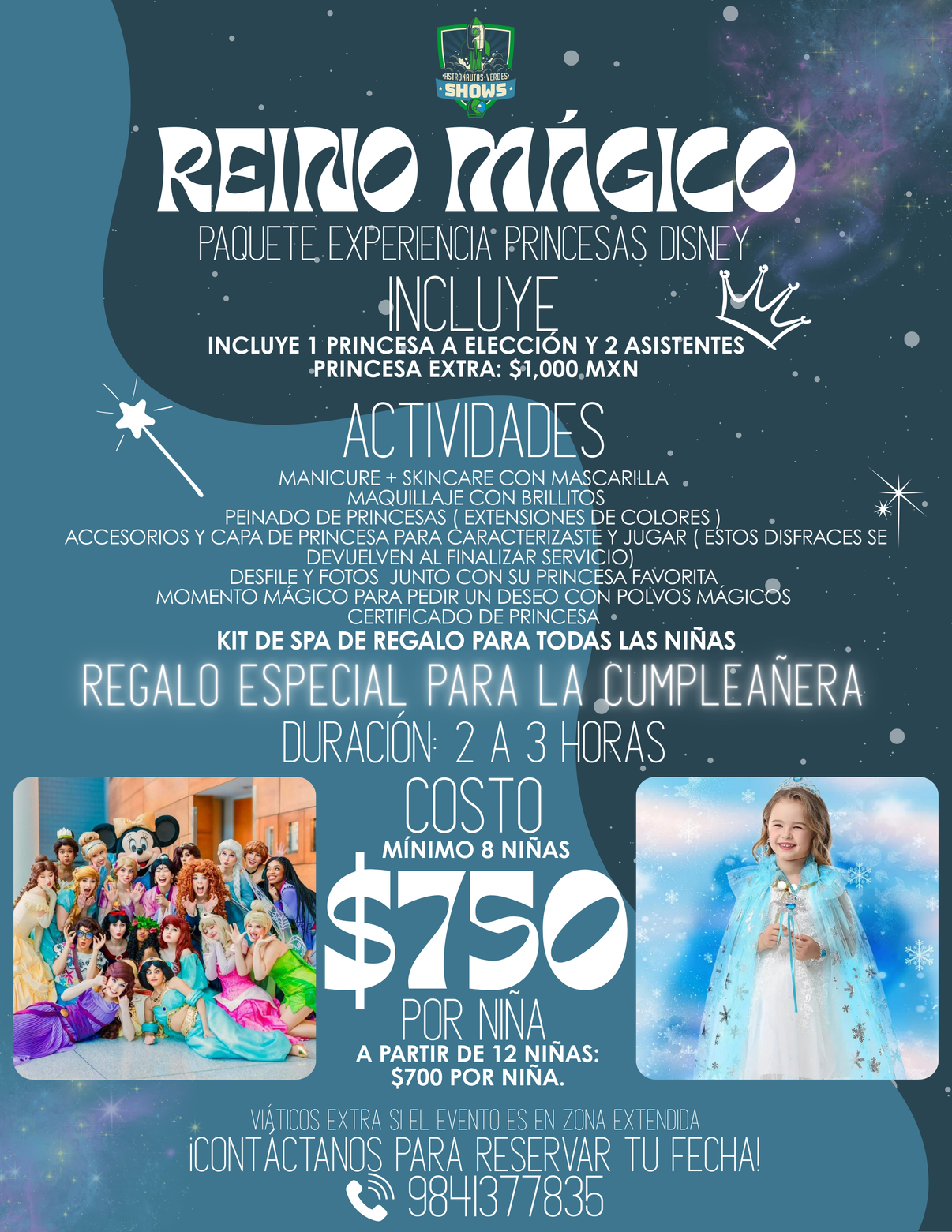- 8 niñas – $6,000 MXN (incluye 1 princesa + 2 asistentes.